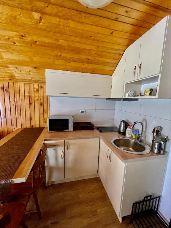 čajna kuhinja, frižider, mikrotalasna rerna, električno kuvalo, posuđe, ploča za kuvanje, sto za ručavanje, čaše za vino